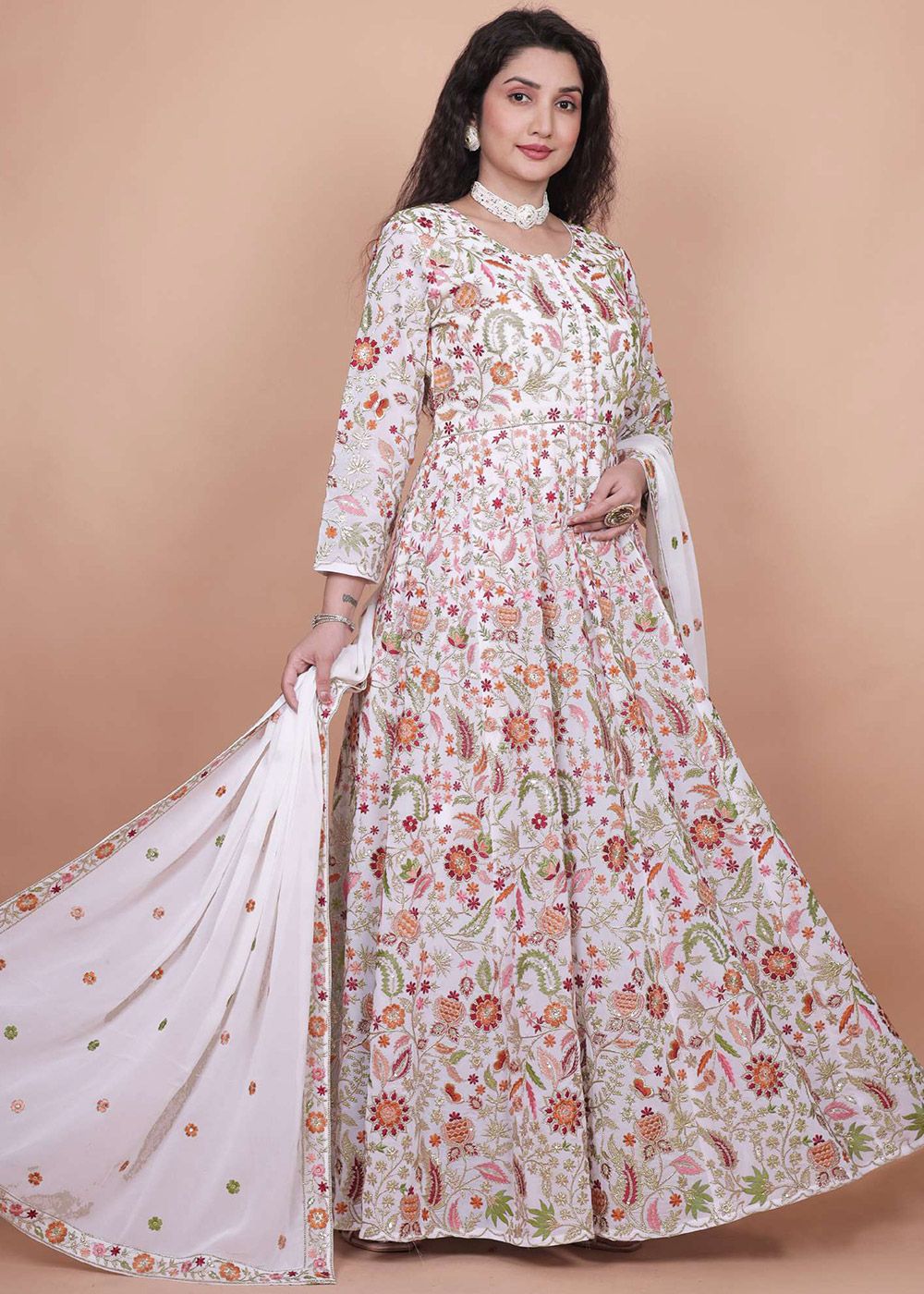 White Embroidered Anarkali Suit In Georgette