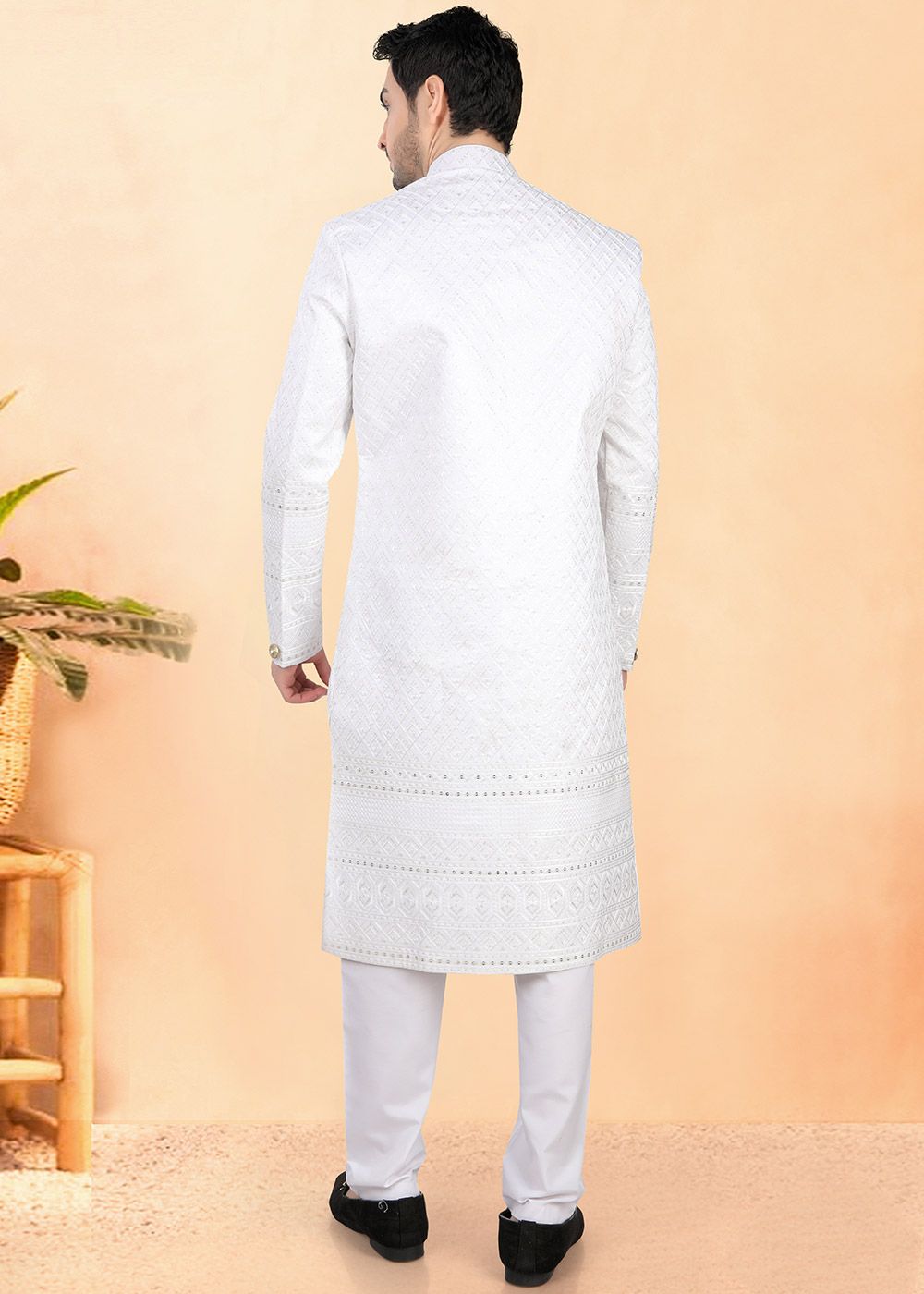 White Woven Men Indo Western Sherwani SetSpecial Price US$114.00 Regular Price US$152.00