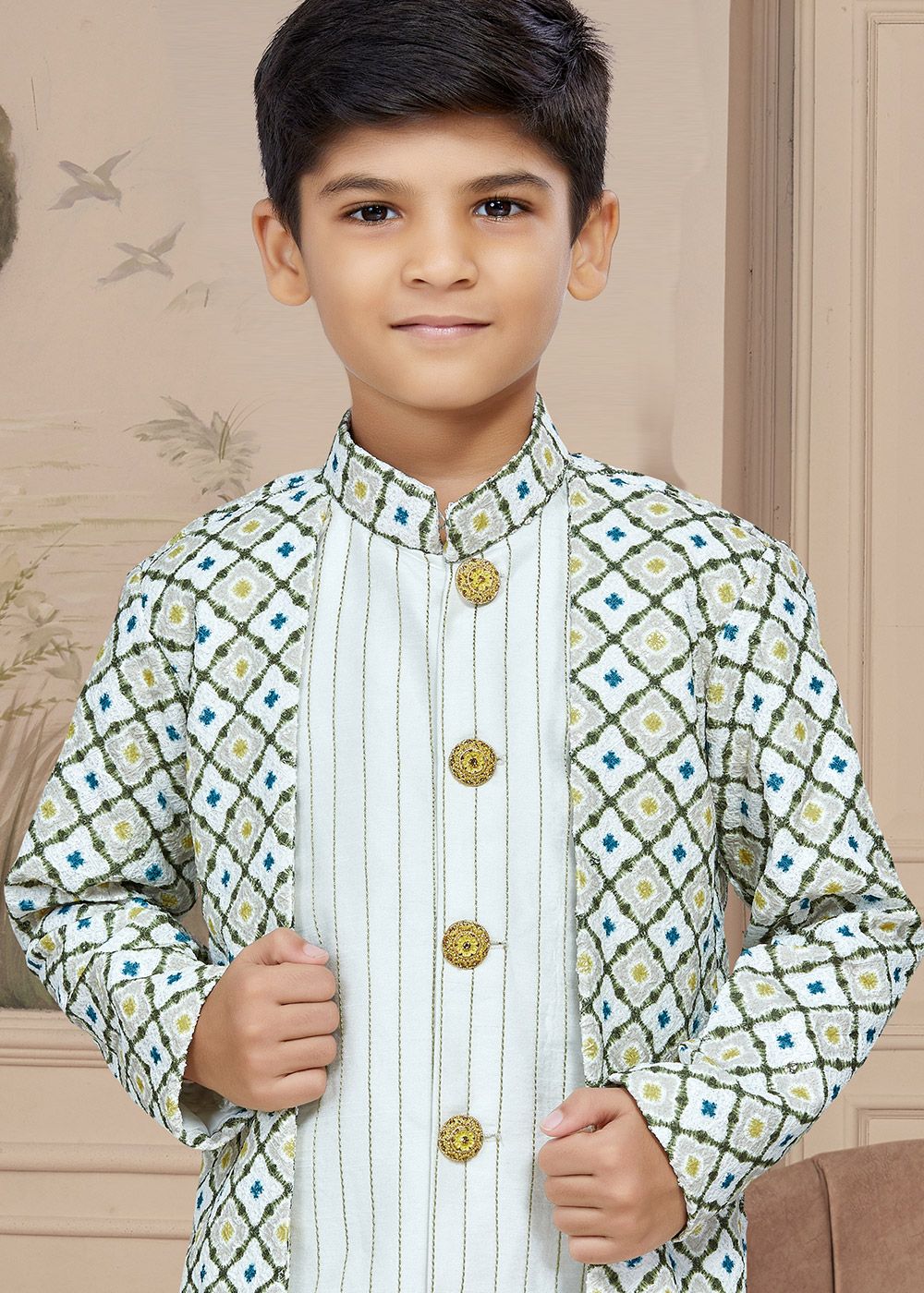 Off White Jacket Style Kids Readymade Embroidered Sherwani SetSpecial Price US$115.20 Regular Price US$144.00 -