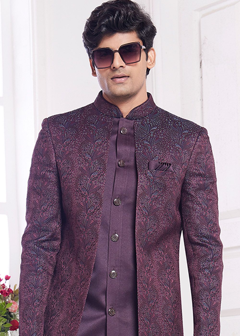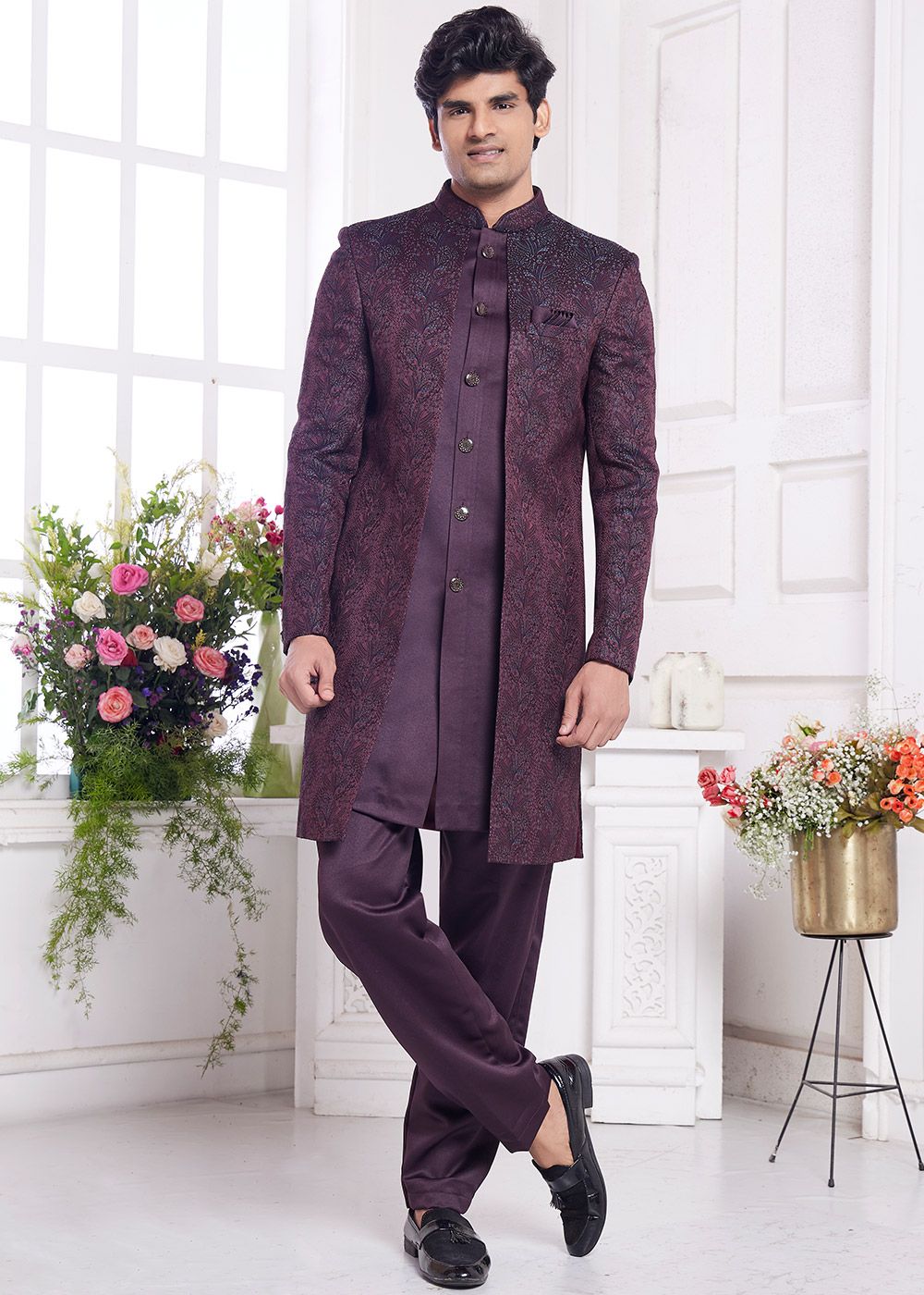 Wine Embroidered Indo Western Sherwani SetSpecial Price US$183.75 Regular Price US$245.00 -
